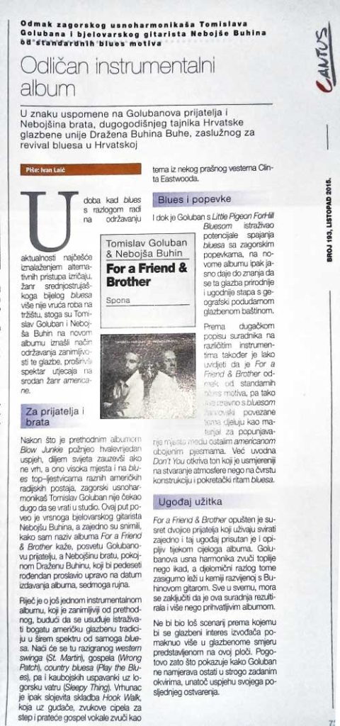 Album “For Friend & Brother” Tomislava Golubana i Nebojše Buhina njihov je glazbeni i osobni tribute Draženu Buhinu, čovjeku koji je ova dva glazbenika spajao za života, a tako je nastavio i nakon svoje prerane smrti 2012 godine. Za razliku od ranije objavljenog tribute albuma na kojem su uglazbljeni Draženovi tekstovi , ovi višestruko nagrađivani glazbenici prvi put su spojili svoja najjača glazbena oružja kombinirajući vrhunsko sviranje usne harmonike (Goluban) sa instrumentalnom glazbom (Buhin). Rezultat je iznenađujuće raznovrstan i zanimljiv album u kojem se susreću Golubanove skladbe i Buhinovi aranžmani.